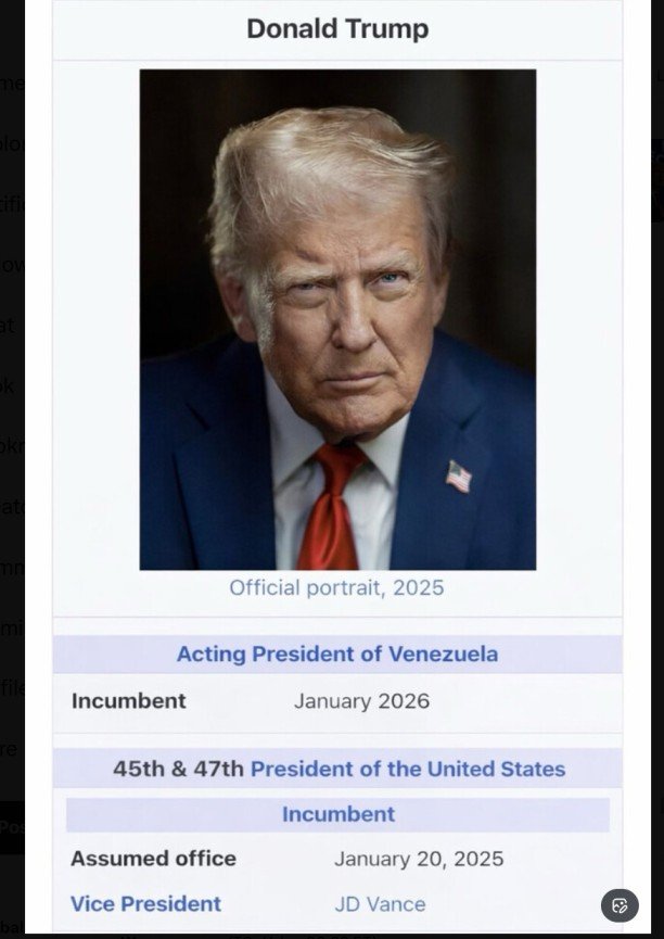ట్రంప్ షేర్ చేసిన చిత్రంలో ఆయన ఫొటోతో కూడిన ఓ వికీపీడియా పేజీ స్క్రీన్షాట్ కనిపిస్తోంది. అందులో “డొనాల్డ్ ట్రంప్ – వెనెజువెలా తాత్కాలిక అధ్యక్షుడు (జనవరి 2026 నుంచి)” అంటూ ఎడిట్ చేసిన వివరాలు ఉన్నాయి. అయితే ఇది అధికారిక వికీపీడియా ఎంట్రీ కాకుండా, ఎవరో ఉద్దేశపూర్వకంగా ఎడిట్ చేసిన పేజీగా స్పష్టమవుతోంది.